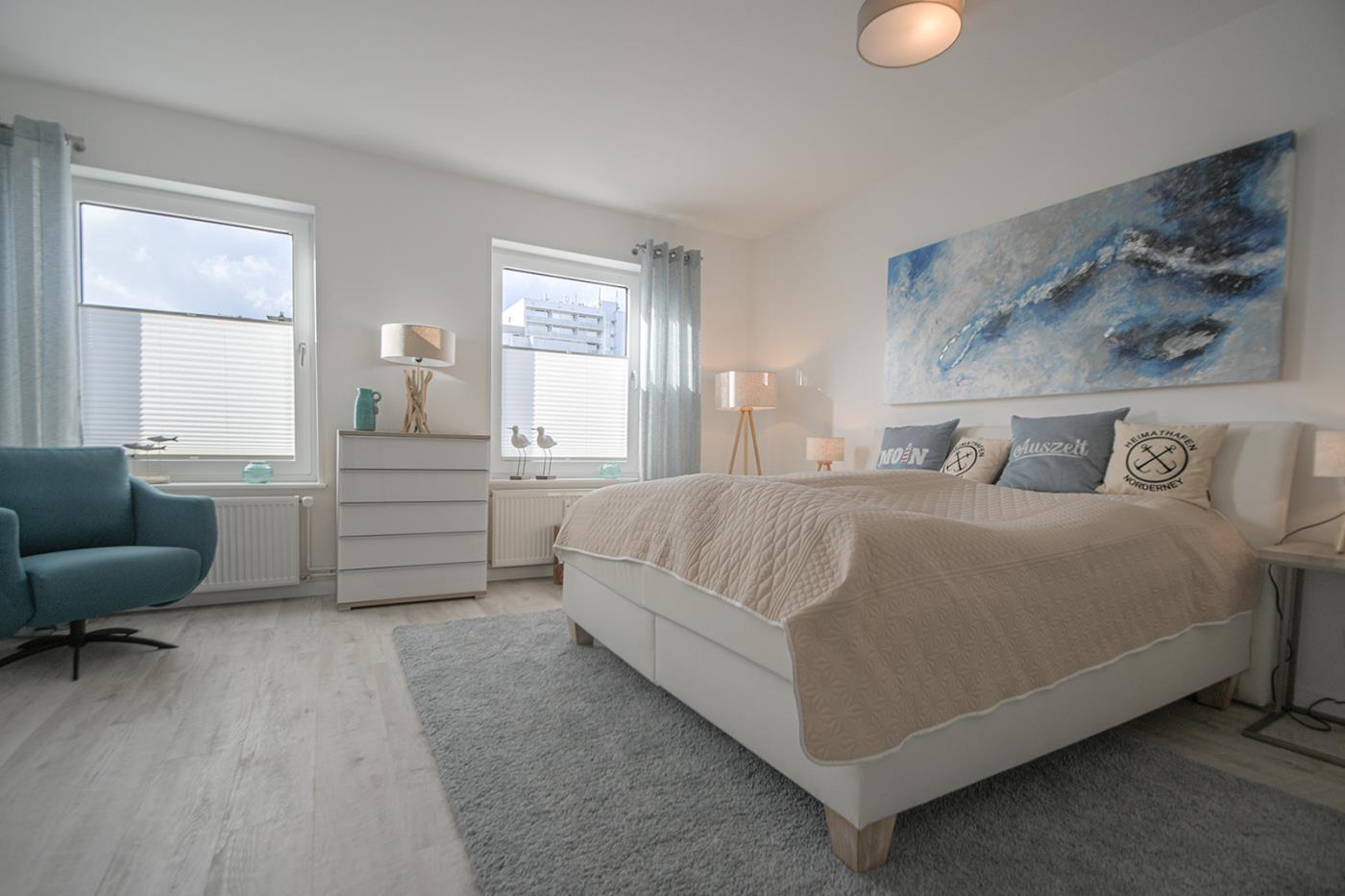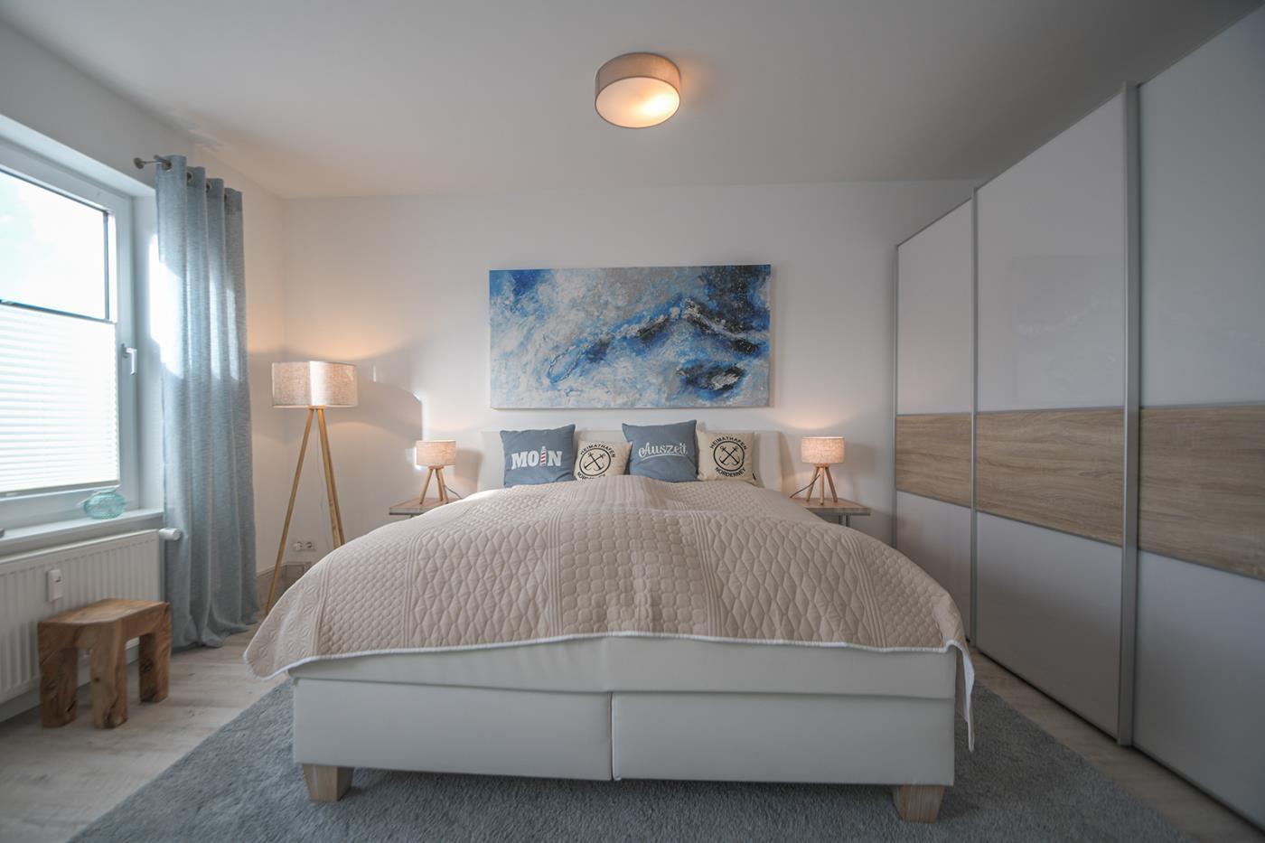 In der Ferienwohnung „Heimathafen“ wartet ein großes lichtdurchflutetes Schlafzimmer mit einem 180cm x 200cm großen Boxspringbett auf Sie. Von hier aus genießen Sie seitlichen Meerblick. Bei geöffnetem Fenster können Sie hier dem Meeresrauschen lauschen. Ein Reisebettchen & ein Hochstuhl sind vorhanden. Ein großer Kleiderschrank und eine Kommode sind weitere Ausstattungsmerkmale des Schlafzimmers. Von diesem Raum aus erreichen Sie das moderne Bad.
