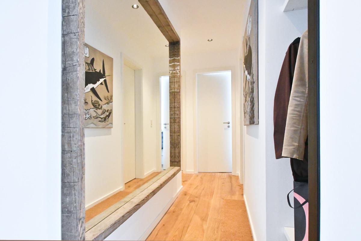 Der Flur zu Bad, WC und den Schlafzimmern verfügt über einen XXL Spiegel aus Antikholz, einer Garderobe und Abstellschrank.