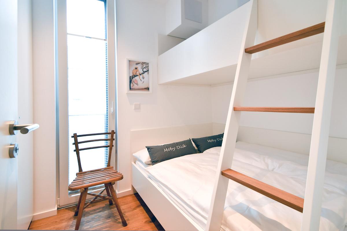 Im zweiten Schlafzimmer finden Sie ein Hochbett mit einer Liegefläche von 140 x 200 cm (unten) und 90 x 200 cm (oben), sowie einen geräumigen Schrank.