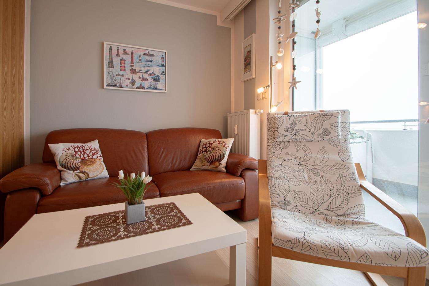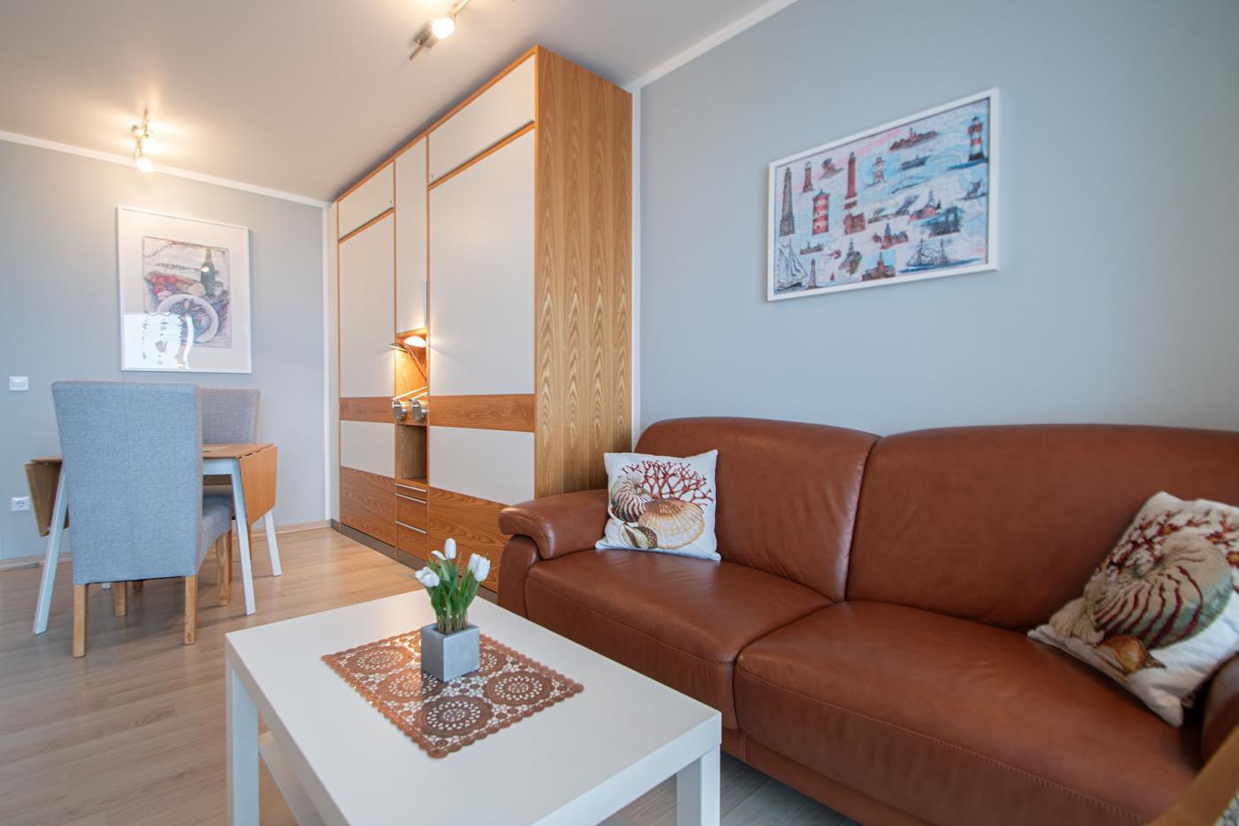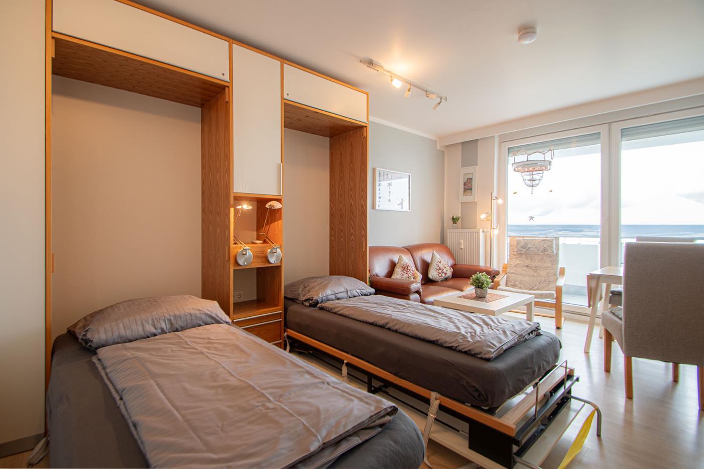 Dieses Feriendomizil mit direktem Meerblick verfügt über eine hochwerige Einrichtung und ist ein idealer Rückzugsort für Ihren Urlaub zu zweit. Der spektakuläre Meerblick wird Sie begeistern. Die Ferienwohnung verfügt über einen hellen Wohn-, Schlafbereich, der mit zwei sehr komfortablen und hochwertigen elektrischen Schrankbetten sowie einem Flachbildfernseher, einer gemütlichen Couch und einem Esstisch ausgestattet ist.