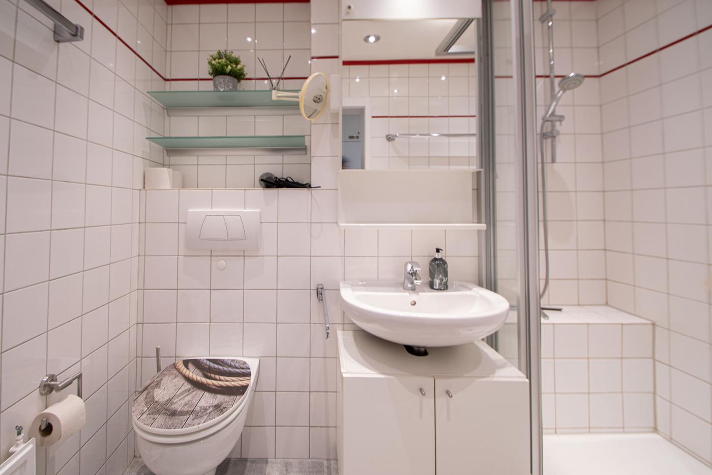 Das moderne Badezimmer bietet eine Dusche, WC und ein Waschbecken.