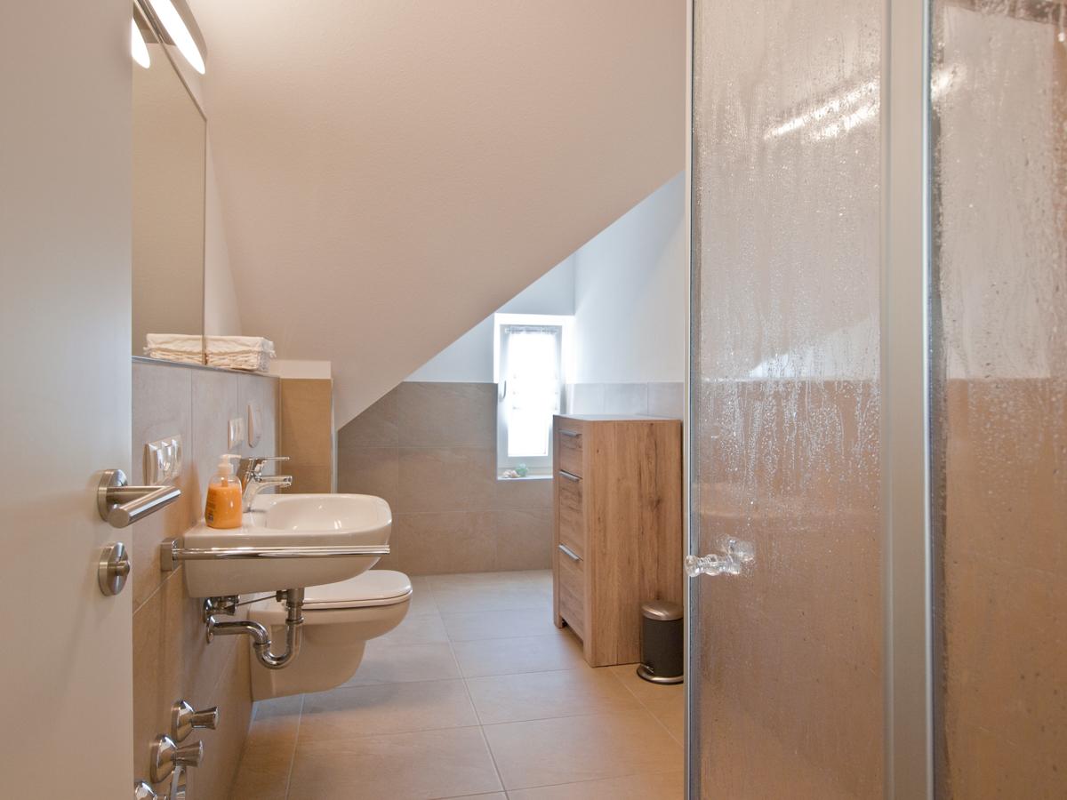 Großzügiges Tageslicht-Bad mit bodengleicher Dusche, Handtuchtrockner, WC und Fön.