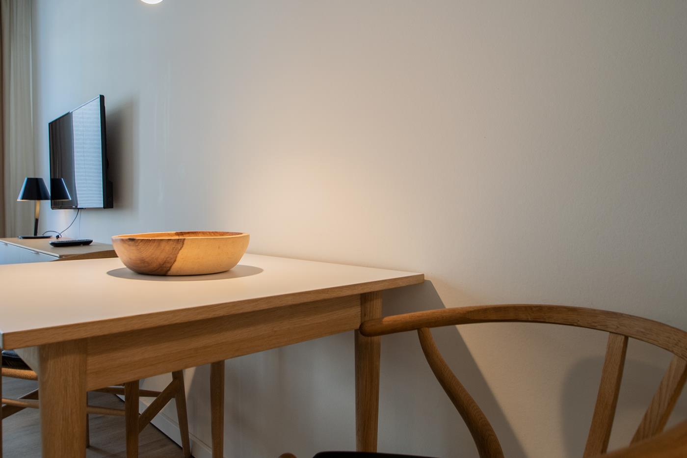 Sie betreten die Wohnung direkt durch einen eigenen Eingang und befinden sich nun im hellen Wohnbereich. Hier finden Sie ein komfortables Sofa mit Bettfunktion, einen Essbereich für zwei Personen, einen Flachbildfernseher und einen geräumigen Schrank.