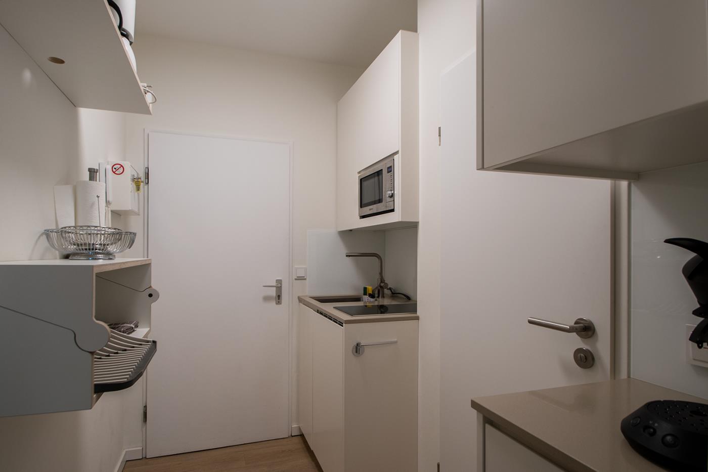 Ihr Ferienappartement verfügt über eine moderne kleine Küche mit Kühlschrank, Kaffeepad-Maschine, Mikrowelle u.v.m.