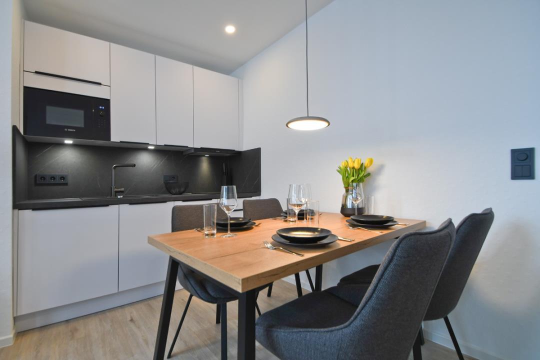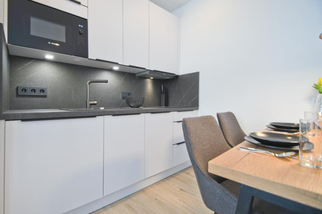 Die Zweiraum-Ferienwohnung ist für 2 Erwachsene und 2 Kinder geeignet und neu und zeitlos eingerichtet. Es bietet Komfort in angenehmer und ruhiger Atmosphäre. Ausgestattet ist es mit Kabel-TV und Flachbildschirmen. Unsere Küche ist komplett eingerichtet einschl. Mikrowelle für den kleinen oder großen Hunger.
