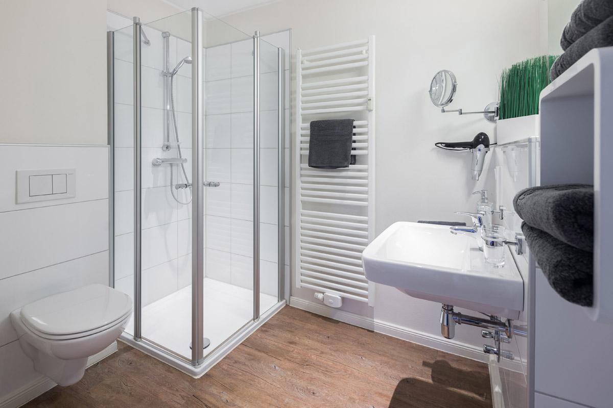 Ihre Ferienwohnung ist mit einem komfortabel eingerichteten Bad ausgestattet. Dieses verfügt über eine große Dusche, Fön und Kosmetikspiegel.