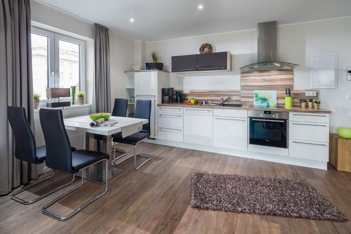 Ihre Ferienwohnung verfügt über eine moderne, großzügige Wohnküche mit folgenden hochwertigen Ausstattungsdetails: Induktionsherd, Backofen, Spülmaschine, Mikrowelle, Toaster, Wasserkocher, Kaffeemaschine, Nespressomaschine, Mixer und Kühlschrank mit Gefrierfach. Ein kleiner Balkon lädt zum Verweilen ein (Ausrichtung Norden).