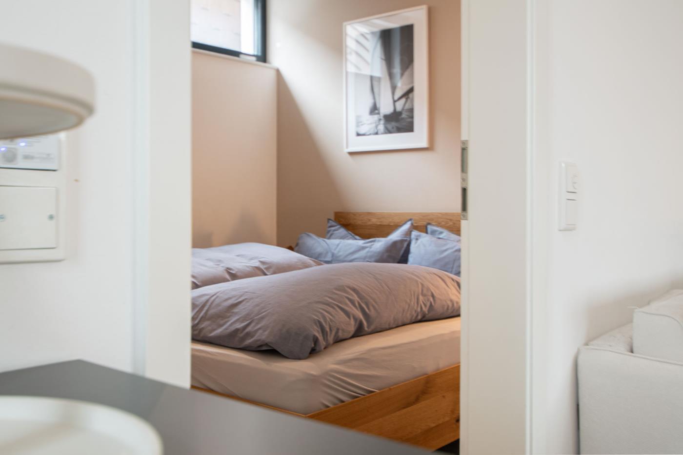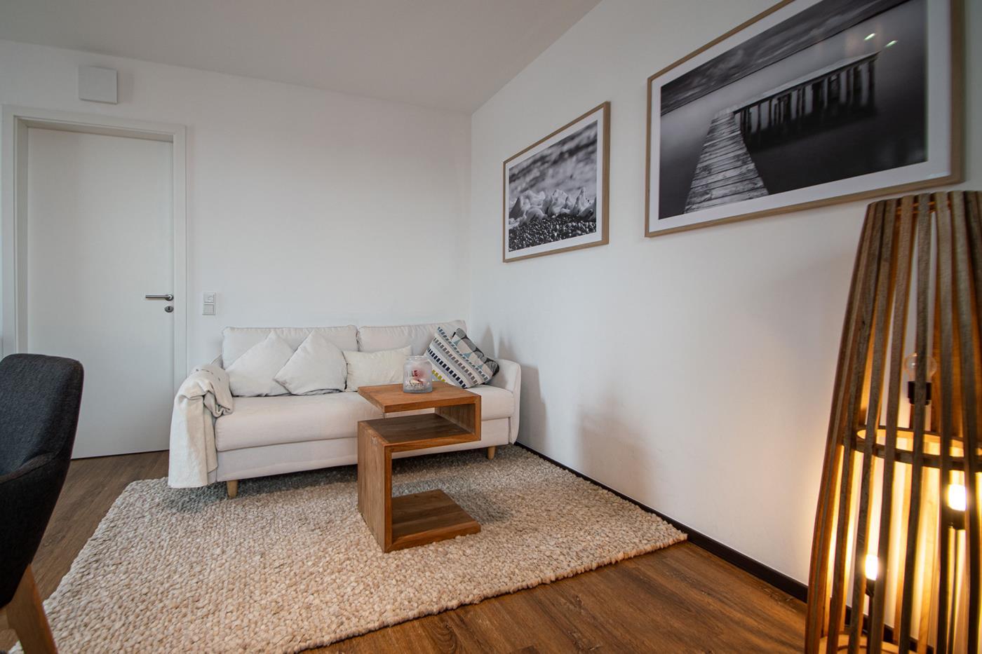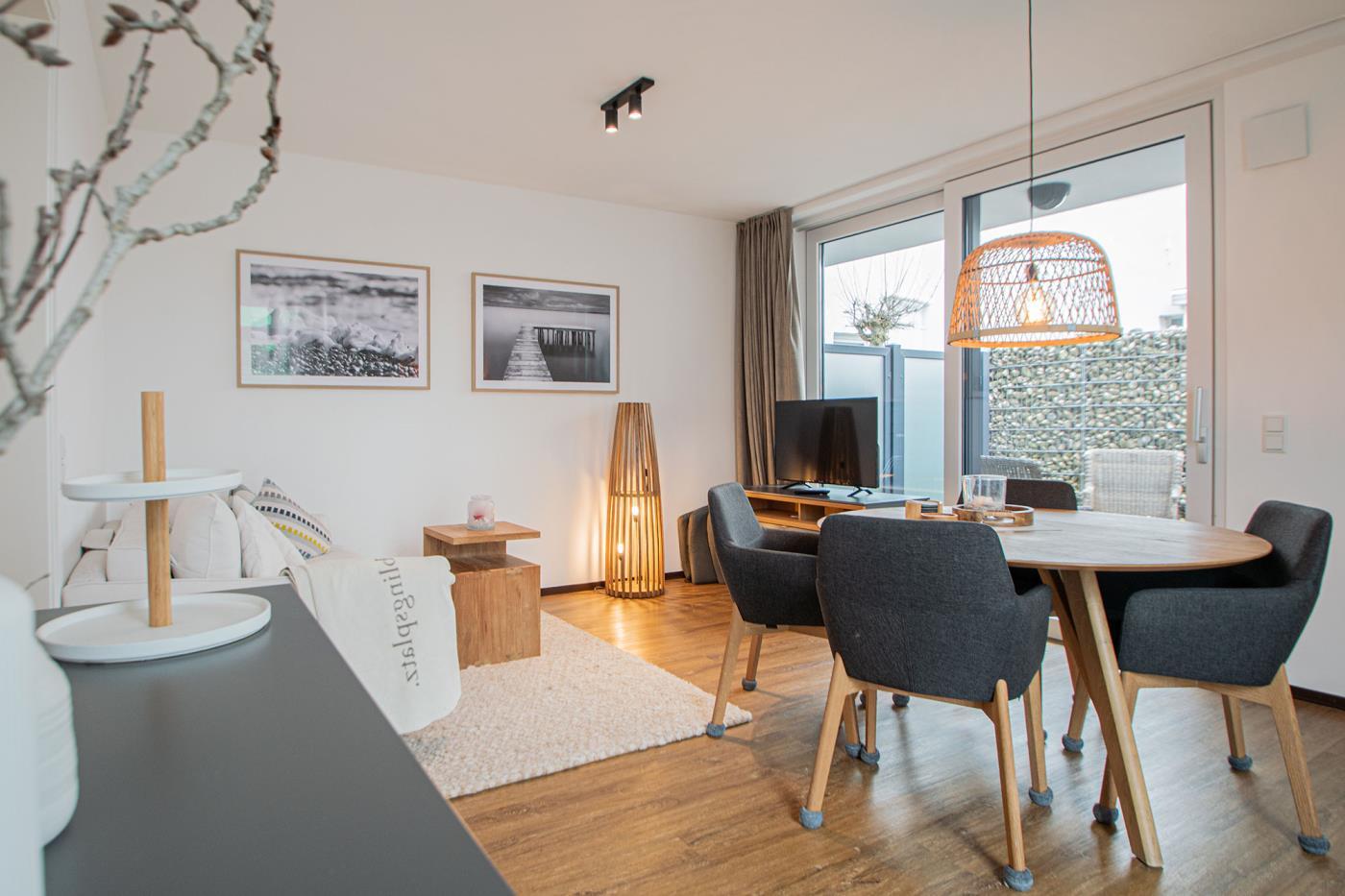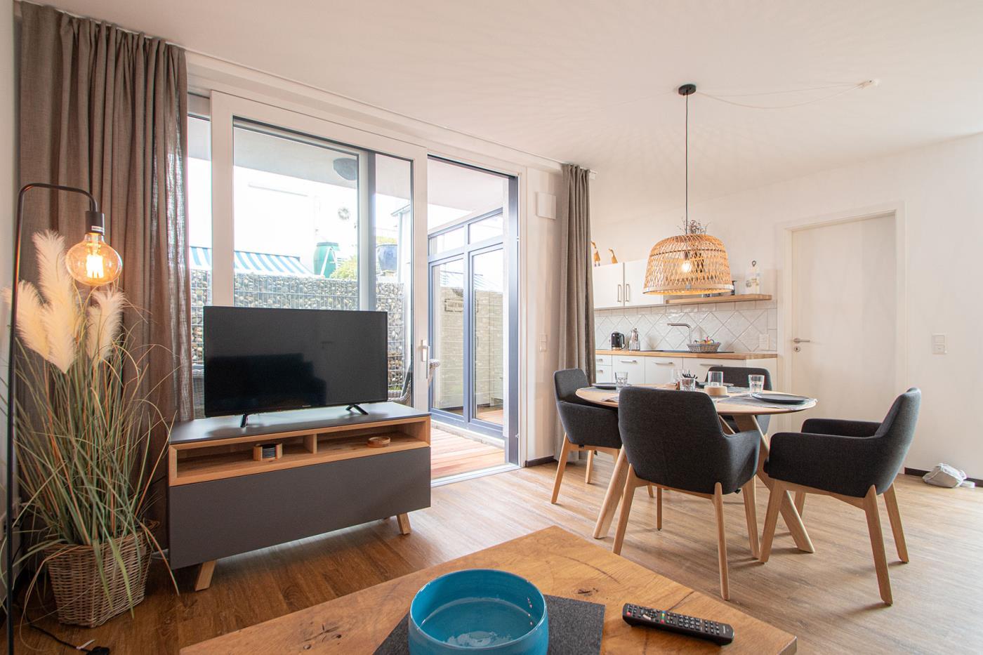 Über einen eigenen Eingang gelangen Sie in Ihr hochwertig und sehr geschmackvoll eingerichtetes Feriendomizil. Ihnen stehen hier ein großer Wohnbereich mit offener Küche, zwei Schlafzimmer, ein Bad sowie zwei Terrassen zur Verfügung. Natürlich bietet Ihre Ferienwohnung jeglichen Komfort wie z.B. Wlan Flachbildfernseher und eine voll ausgestattete Küche. Eine Waschmaschine und einen Trockner finden Sie im Gemeinschaftsraum des Hauses.