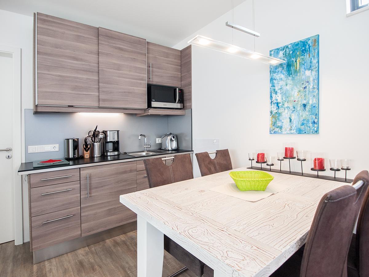 Ihre Ferienwohnung verfügt über eine voll ausgestattete Küche mit Spülmaschine, Induktionskochfeld, Mikrowelle mit Grillfunktion und Umluftofen sowie eine Kaffeemaschine, ein Sandwich-Maker mit Waffeleisen, eine Tchibo Kapselmaschine, eine Küchenwaage, ein Toaster und einen Mixer. Für gemütliche Abende finden Sie in unserer Ferienwohnung auch ein Käsefondue-Set.