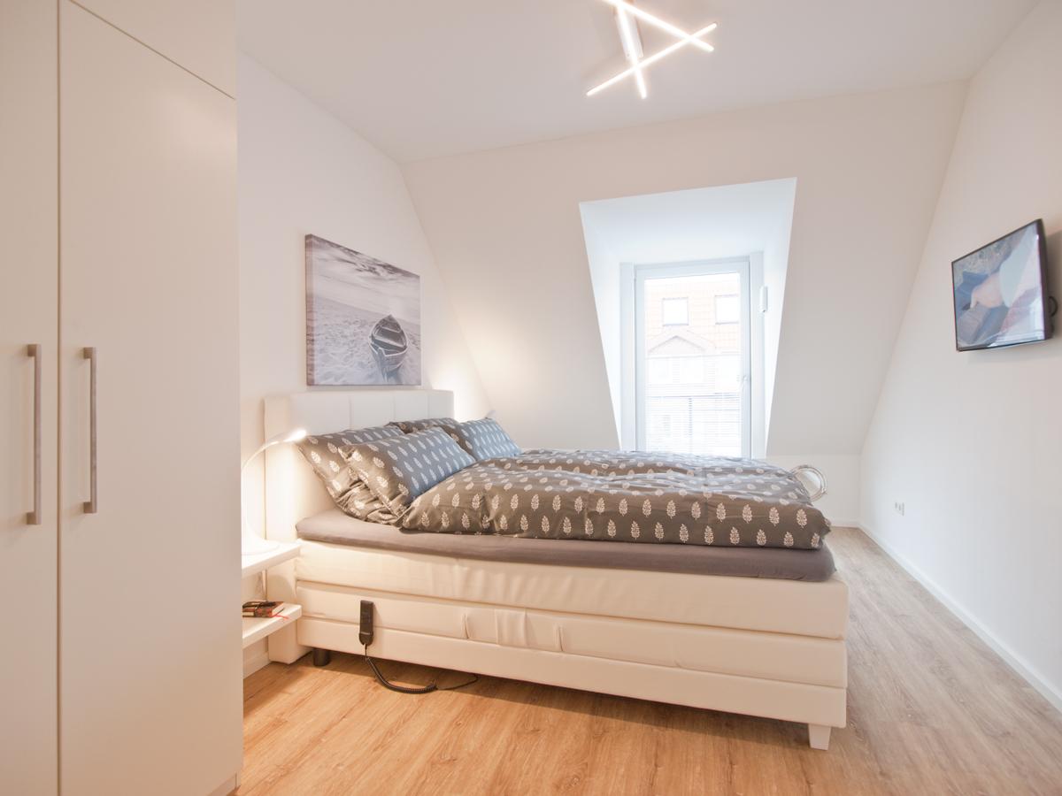 Schlafzimmer Im Dachgeschoss befindet sich Ihr gemütliches Schlafzimmer, ausgestattet mit einem elektrisch verstellbarem Boxspringbett, Kleiderschrank und TV. Ihr Schlafzimmer verfügt über einen zusätzlichen kleinen Balkon.