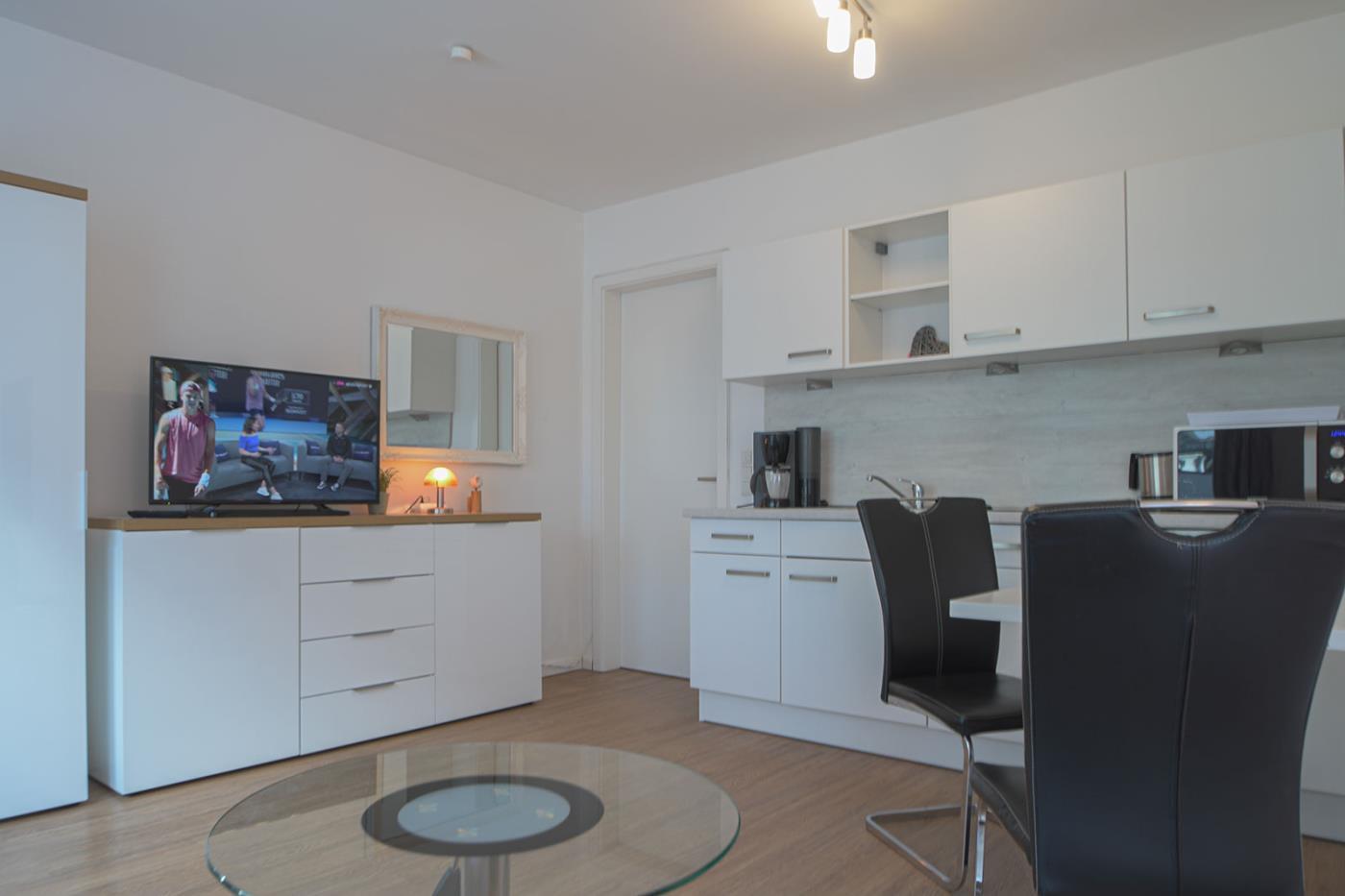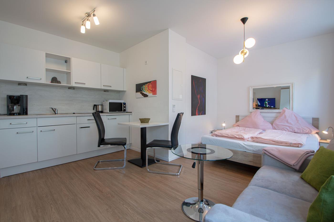 Der große Wohnraum mit angrenzendem Schlafbereich ist der Mittelpunkt Ihres Appartements. Neben einem gemütlichen Sofa finden Sie hier eine komplett ausgestattete Küche (ohne Backofen & ohne Geschirrspüler) mit Tisch und mit zwei Stühlen. Im Schlafbereich finden Sie ein großes Doppelbett.