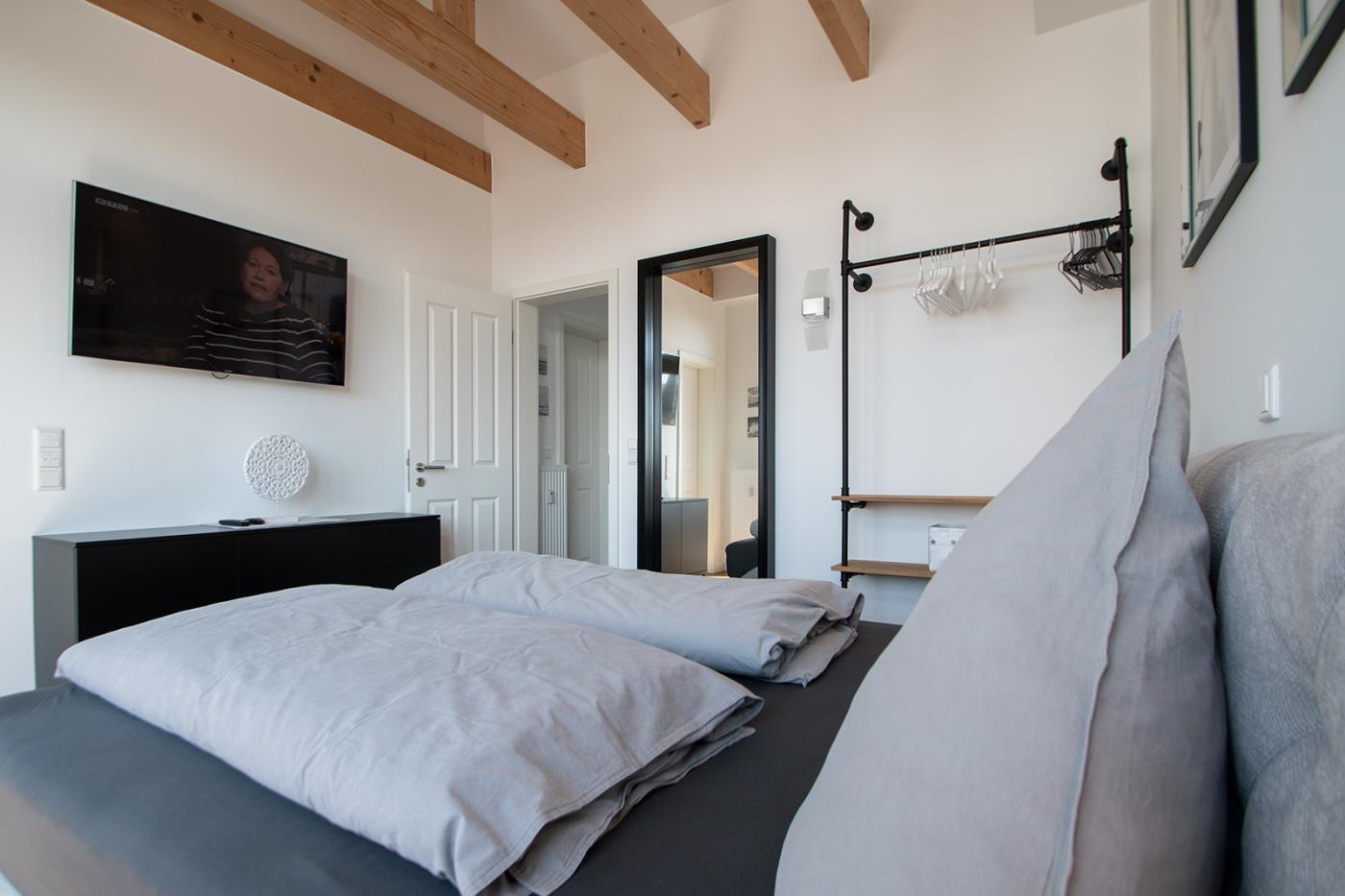 Im Schlafzimmer sorgt ein 1,80 x 200 m großes Doppelbett für einen entspannten Schlaf. Ein großer Flachbildfernseher ist im Schlafzimmer Ihrer Ferienwohnung ebenfalls vorhanden.
