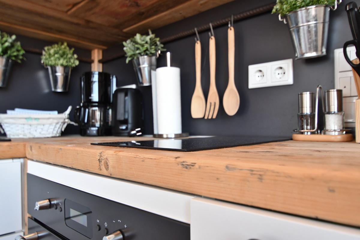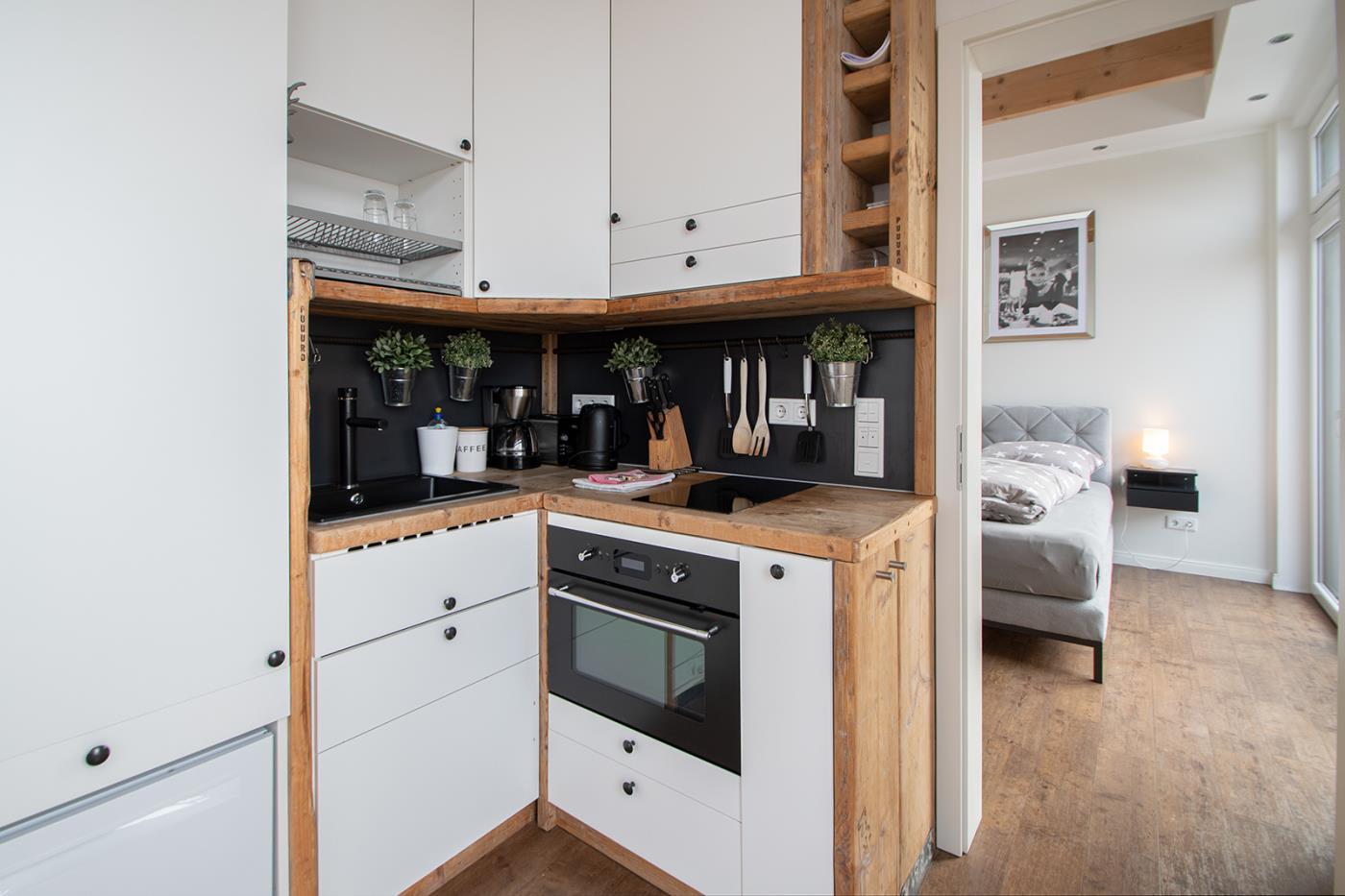 Ihre Küche ist mit einer modernen Einbauküche mit Glas-Keramik-Kochfeld, Backofen, Geschirrspüler und Kühlschrank inklusive Gefrierfach ausgestattet. Der Essbereich mit gemütlicher Bank und 2 Hockern bietet einen schönen Blick über die Dächer von Norderney bis hin zum Meer.