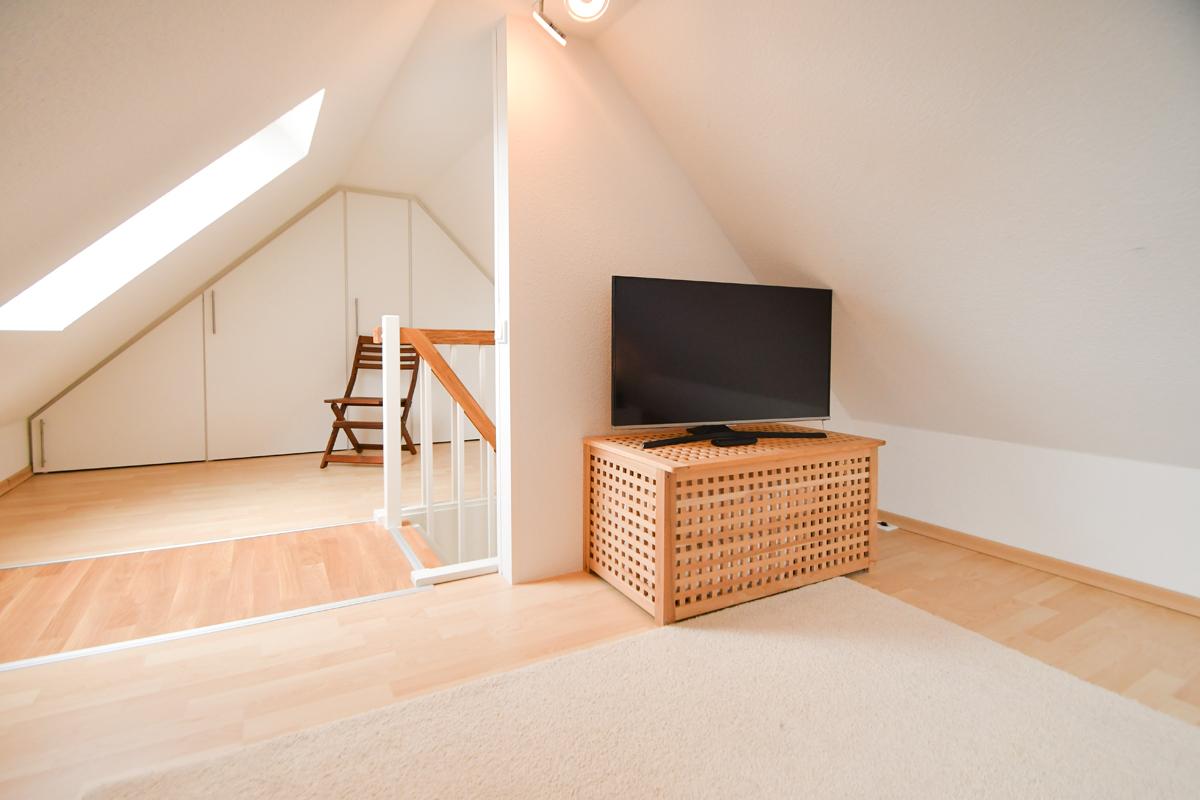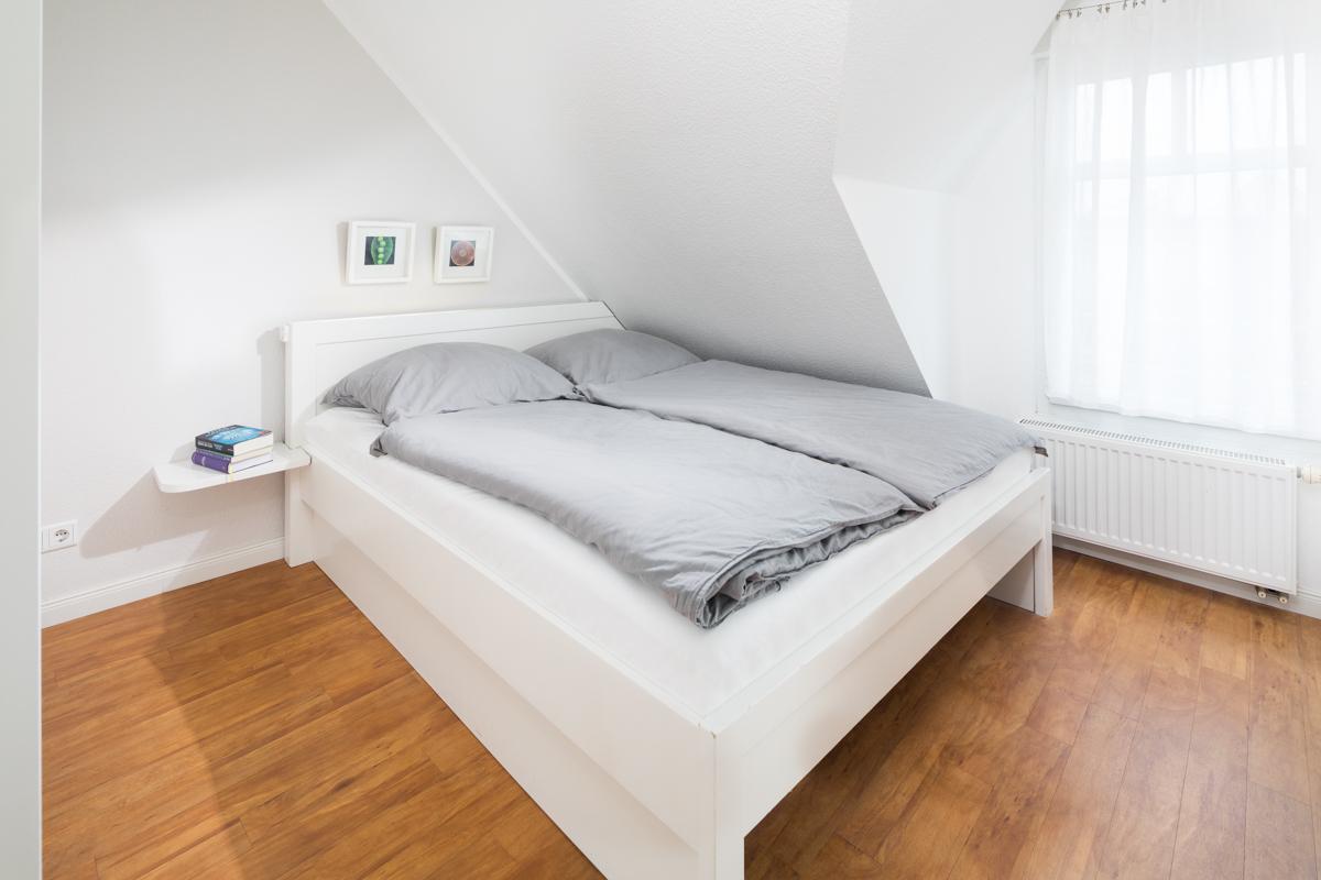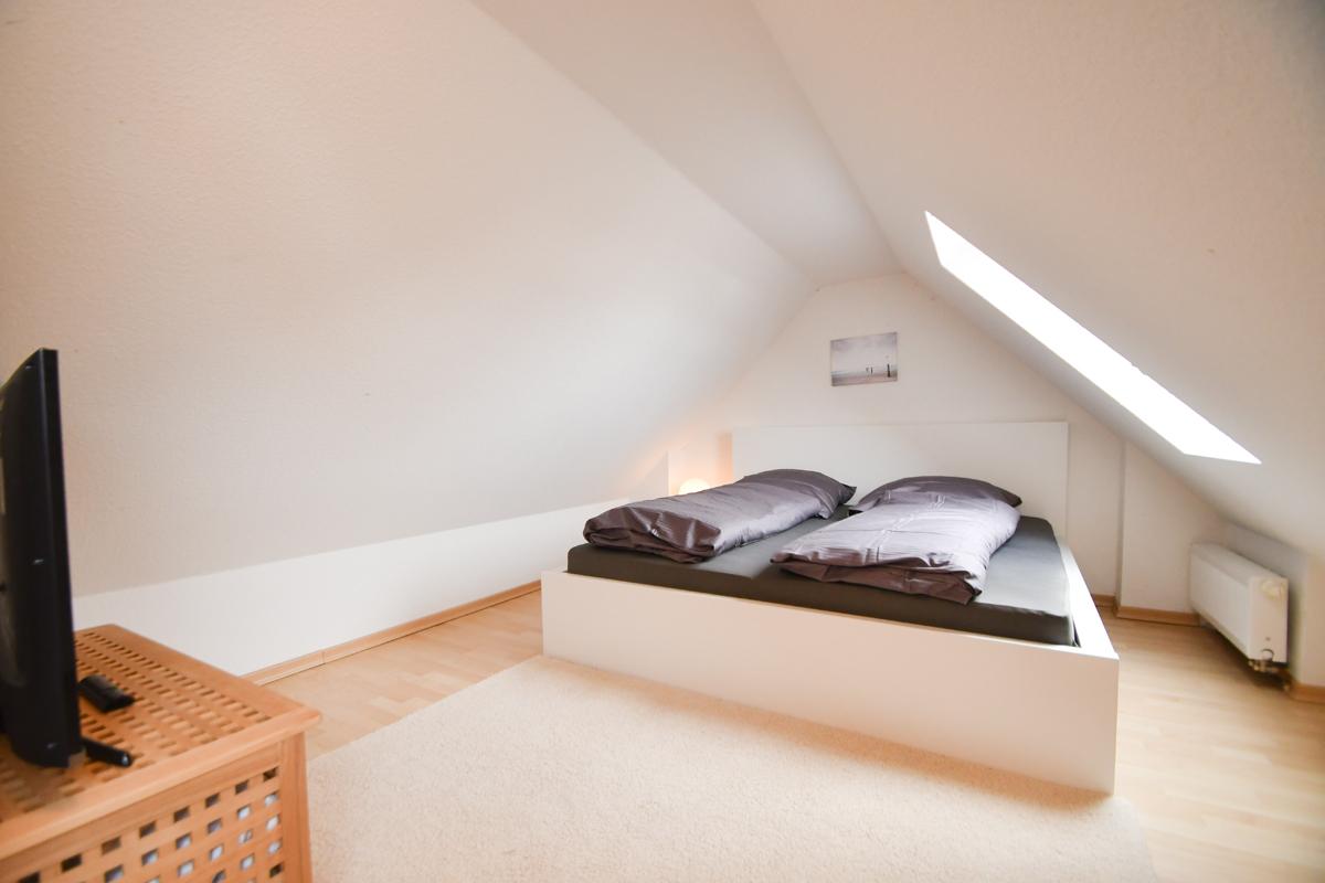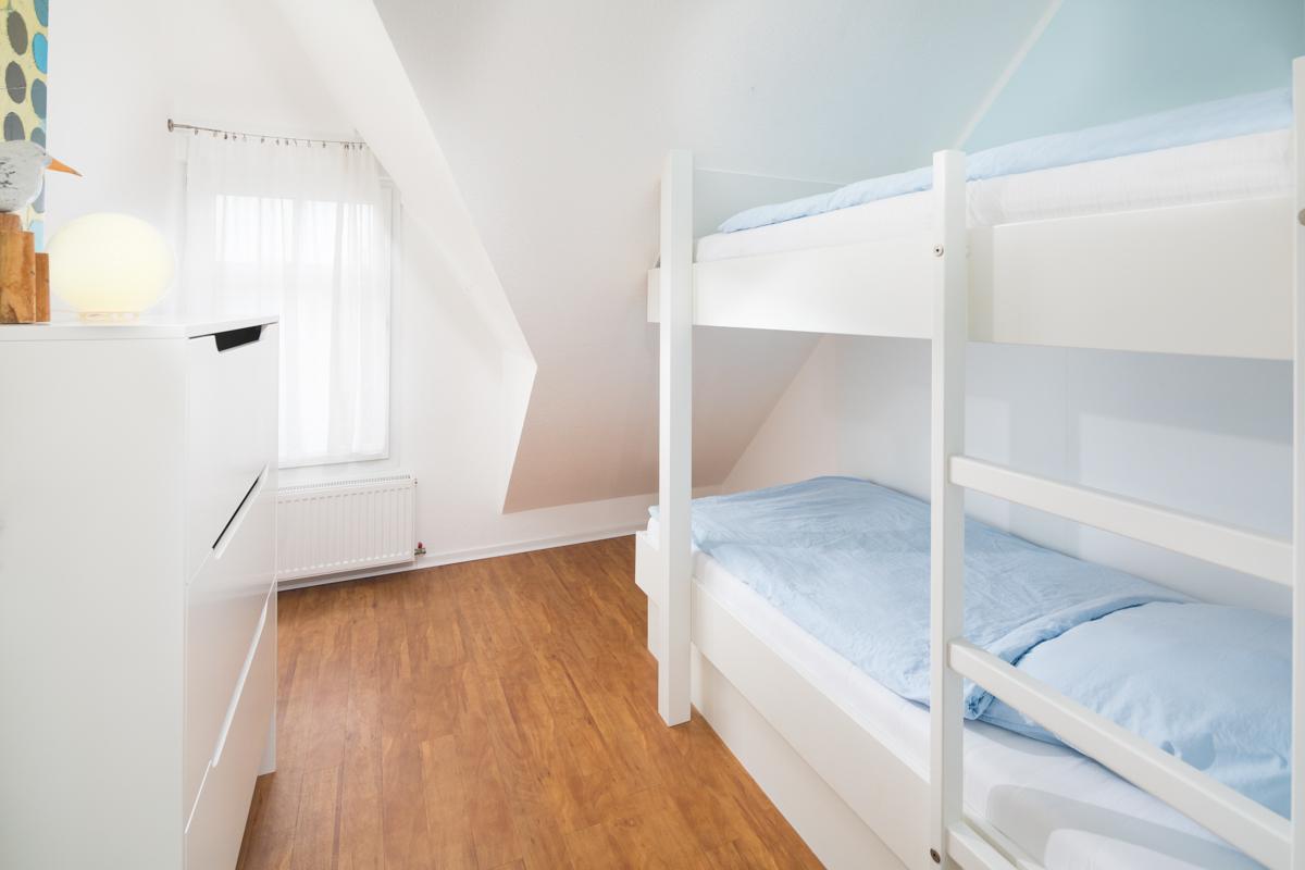 In der Ferienwohnung befinden sich 3 Schlafzimmer. Ein Schlafzimmer mit Doppelbett sowie ein 'Kinderzimmer' mit Etagenbett (Liegefläche unten: 200 x 90 cm. Liegefläche oben: 180 x 90cm) befinden sich auf der Wohnebene. Ein weiteres Schlafzimmer mit einem Doppelbett befindet sich im Spitzboden.