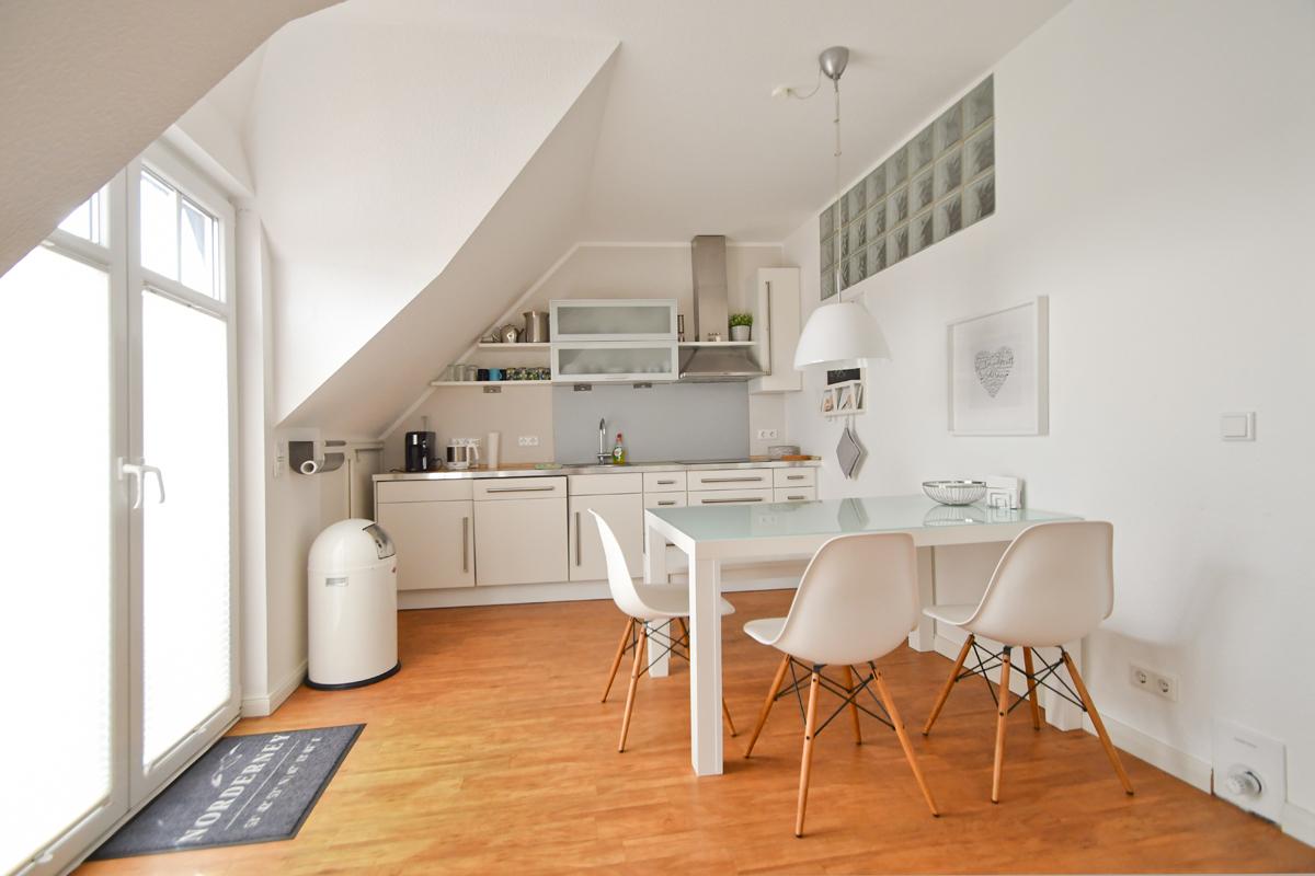 Ihre Ferienwohnung verfügt über eine moderne Küchenzeile mit Cerankochfeld, Spülmaschine, Senseo Padmaschine + Filterkaffeemaschine, Heißluftfritteuse und Kühlschrank.
