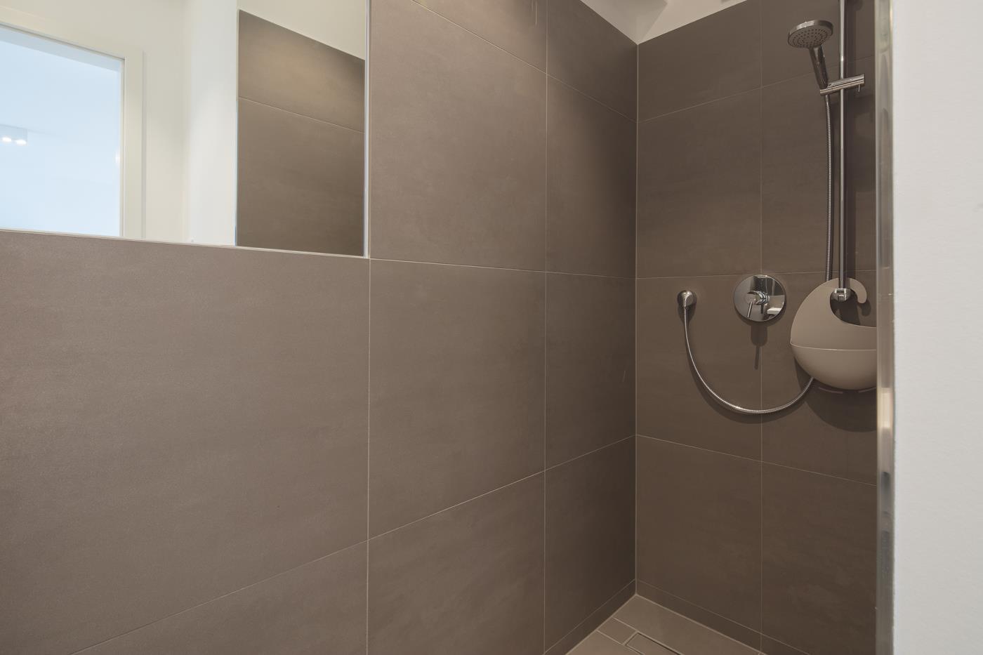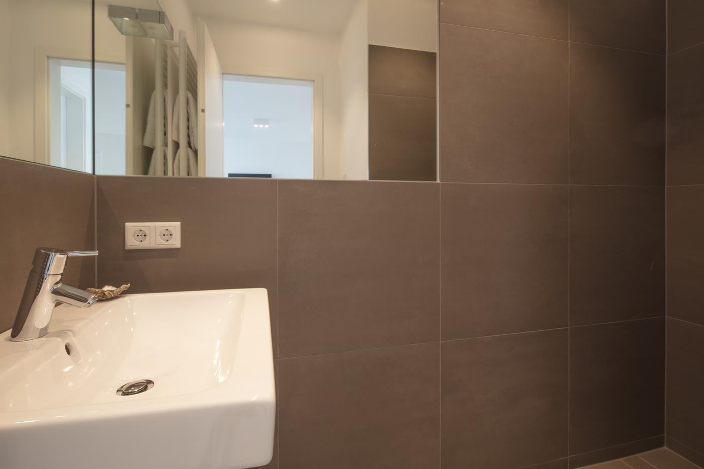 Modernes Bad mit bodengleicher Dusche, Waschtisch, Haartrockner, ausreichenden Ablageflächen und Handtuchheizung.