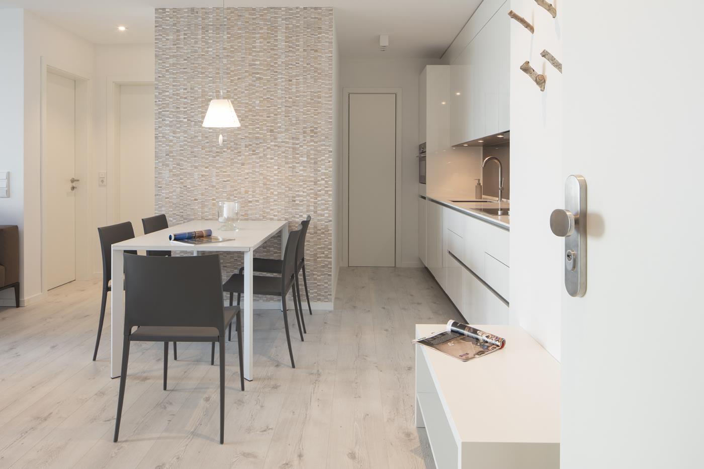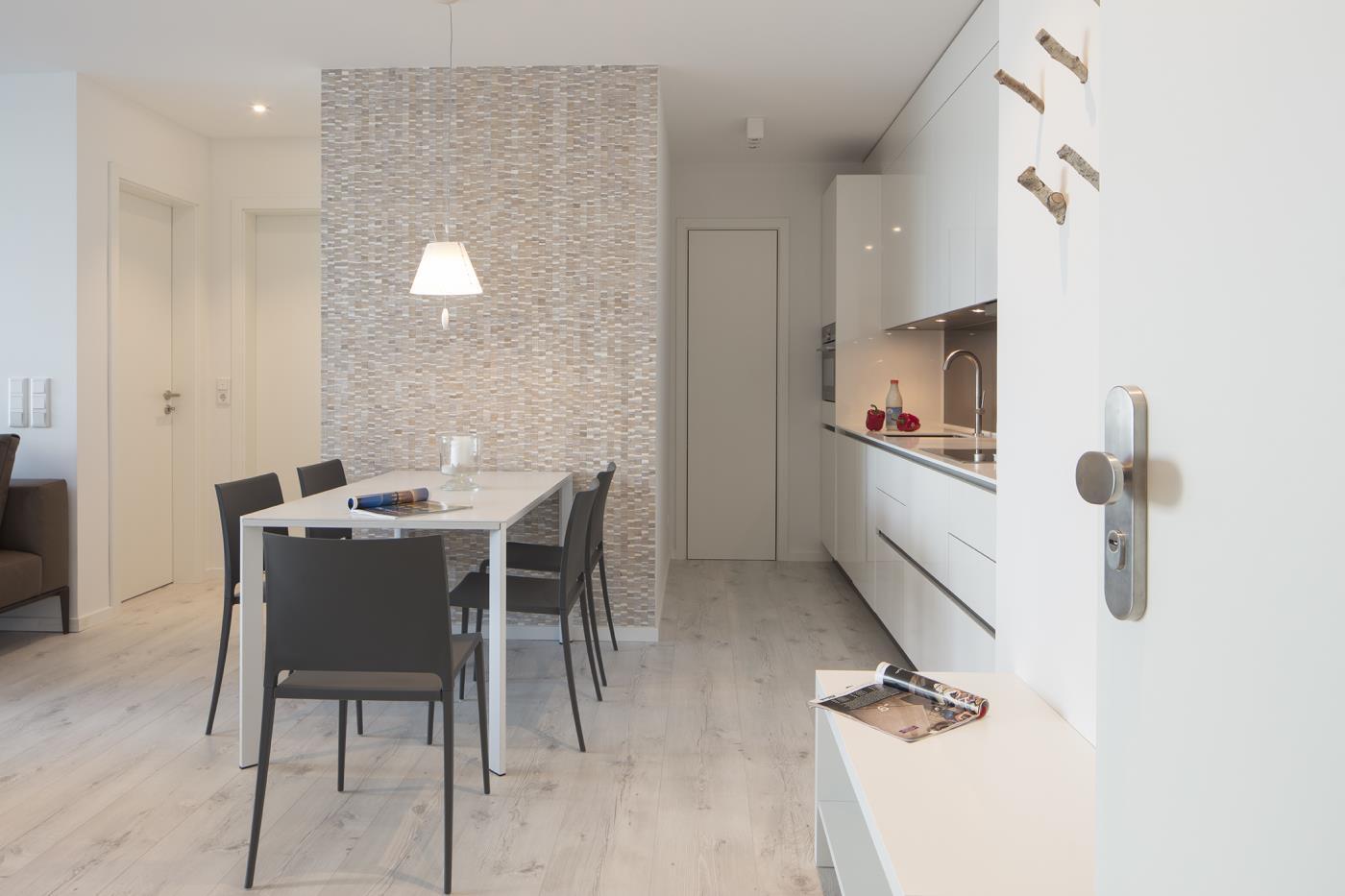Die moderne Küche ist komplett ausgestattet mit einem Kühlschrank mit Gefrierfach, einem Backofen, einer Spülmaschine und einem Kochfeld. Ein Wasserkocher, eine Kapselmaschine mit Milchaufschäumfunktion, eine Kaffeefilter-Maschine, Toaster, Elektro-Tischgrill sowie eine Mini-Küchenmaschine sind ebenfalls vorhanden.