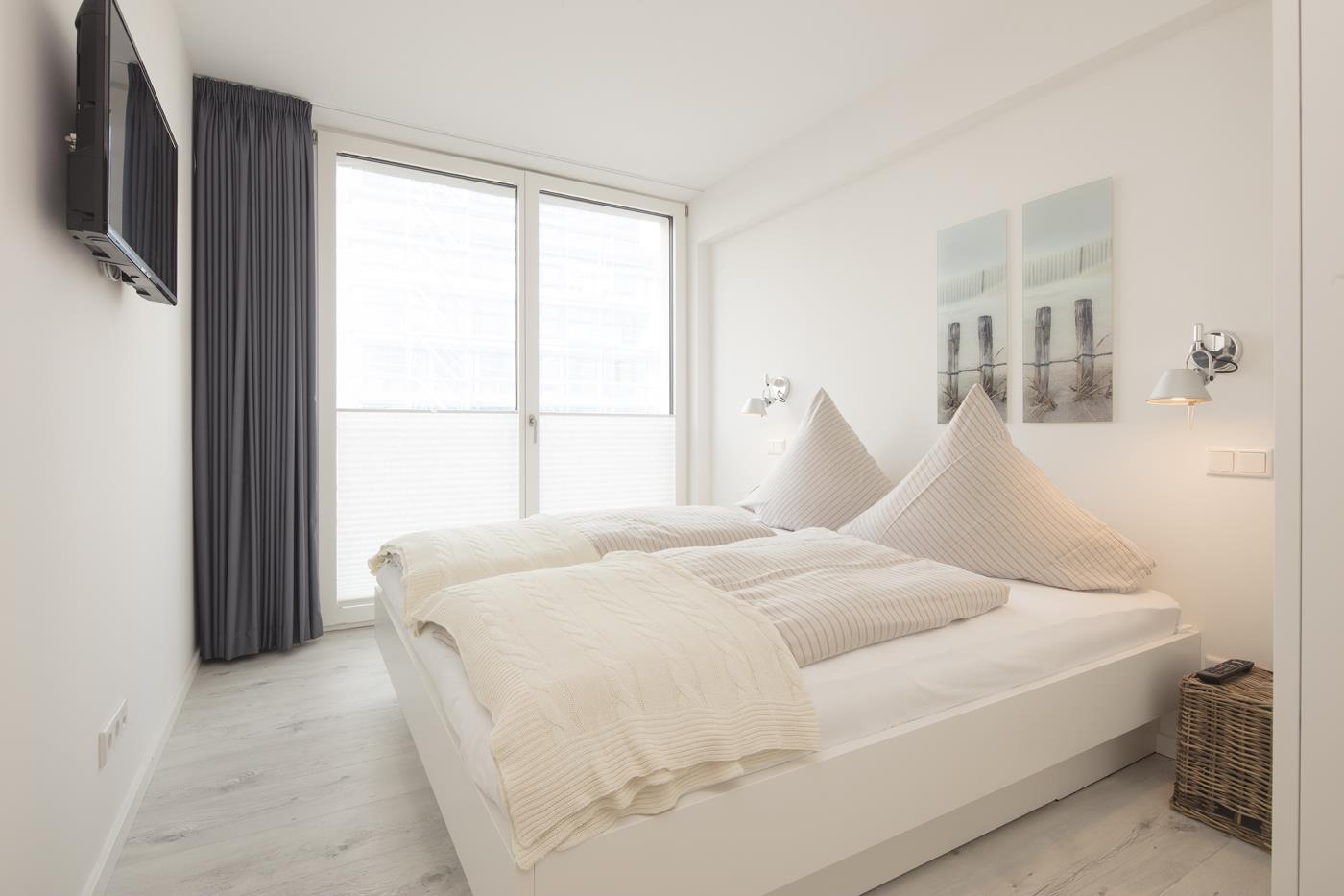 Großes Schlafzimmer mit bodentiefen Fenstern, EInbauschränken und LED-Fernseher. Für einen erholsamen Schlaf bietet diese Ferienwohnung Verdunklungsvorhänge sowie ein 180 x 200 cm großes Doppelbett mit hochwertigen Matratzen.