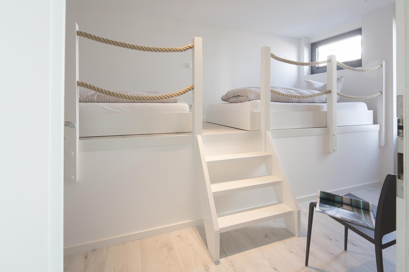 Das zweite Schlafzimmer verfügt über zwei Einzelbetten, die hintereinander auf einer gemütlichen Empore angeordnet sind. Auch im zweiten Schlafzimmer sind Einbauschränke und Verdunklungsvorhänge vorhanden.