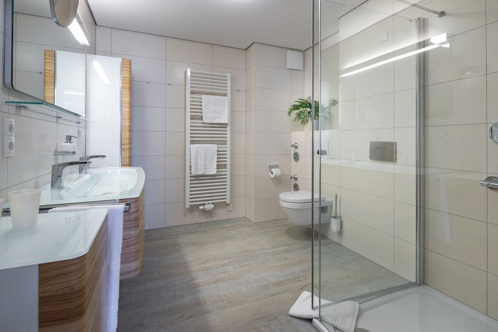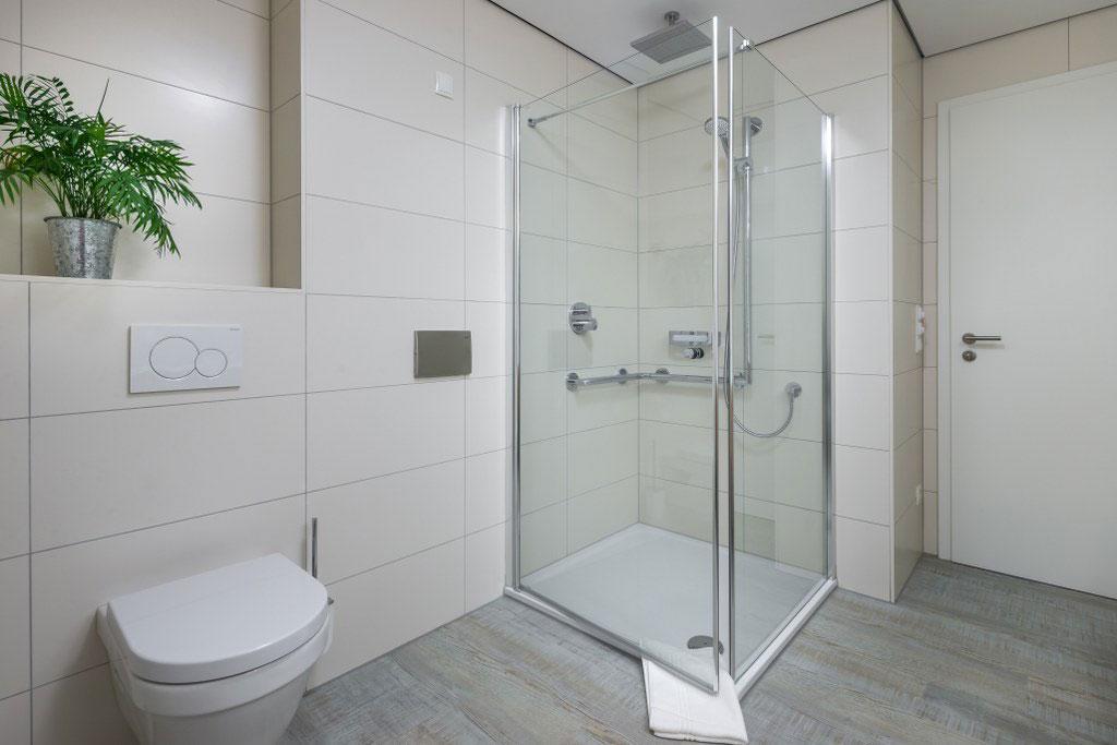 Das großzügig geschnittene Badezimmer ist mit einer bodentief verglasten Dusche, Doppelwaschbecken, Fön, Kosmetikspiegel und einem Handtuchtrockner ausgestattet. Auf Wunsch kann das Badezimmer durch altersgerechte Hilfsmittel (z.B. einem Sitz für die Dusche) ergänzt werden.